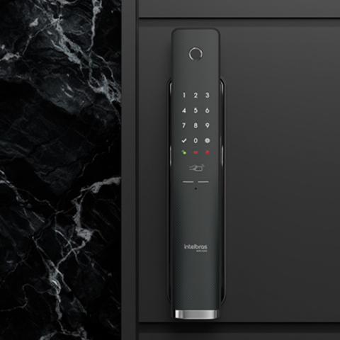 Com a MFR6300, fechadura inteligente de embutir, você pode acessar seu ambiente com até 100 biometrias, 100 tags, 15 senhas, 2 chaves mecânicas e pelo app Mibo Smart¹.